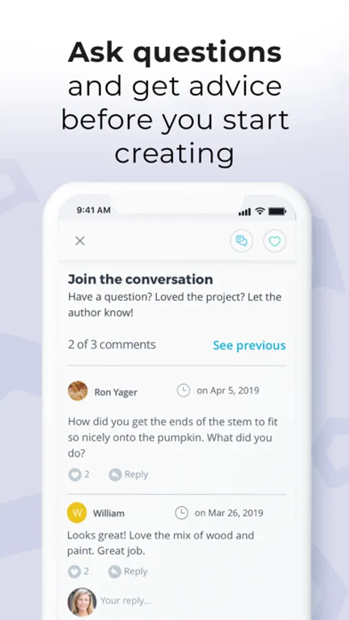 From the app, users can read comments from other Hometalk community members and ask questions on the specific project to the original poster.