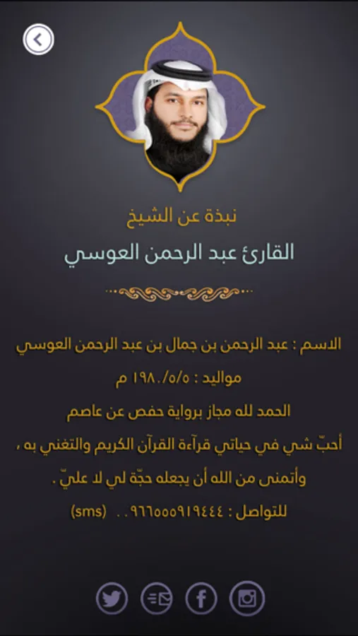 القران كلام الله، من تمسّك به قاده إلى الهدى و الرشاد. الأن، اجعل القرآن رفيقك حيثما كنت، و استمع إلى المصحف الكامل بتلاوة مختارة للشيخ القارئ عبد الرحمن العوسي برواية حفص عن عاصم بجودة صوتية نقية رائعة، دون الحاجة إلى اتصال بالشبكة، أو شراء داخل التطبيق أو إعلانات مزعجة! ختمة كاملة لجميع سور للقرآن الكريم تنتقل خلالها تلقائيا، أو تضيف أحب السور لديك إلى قائمة المفضلة للوصول السريع لها. و كل هذا من خلال تصميم مبتكر مميّز، يحاكي أداء المسجل التقليدي، بتأثيرات الأزرار و لفّ الشريط و غيرها.