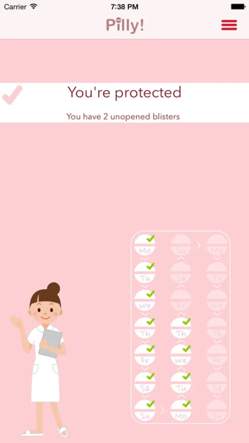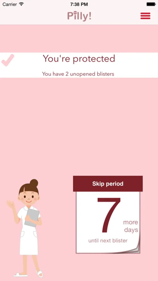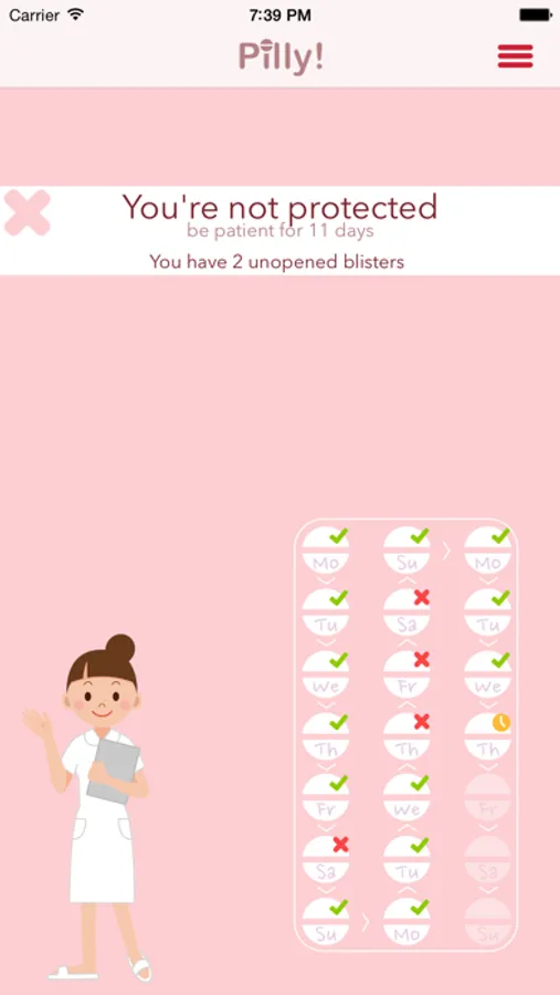 Pilly! doesn't only reminds you to ingest your pill, she also shows you whether you're protected or not. Furthermore Pilly! shows you your number of blisters. Forgot to get new pills? Not anymore.
