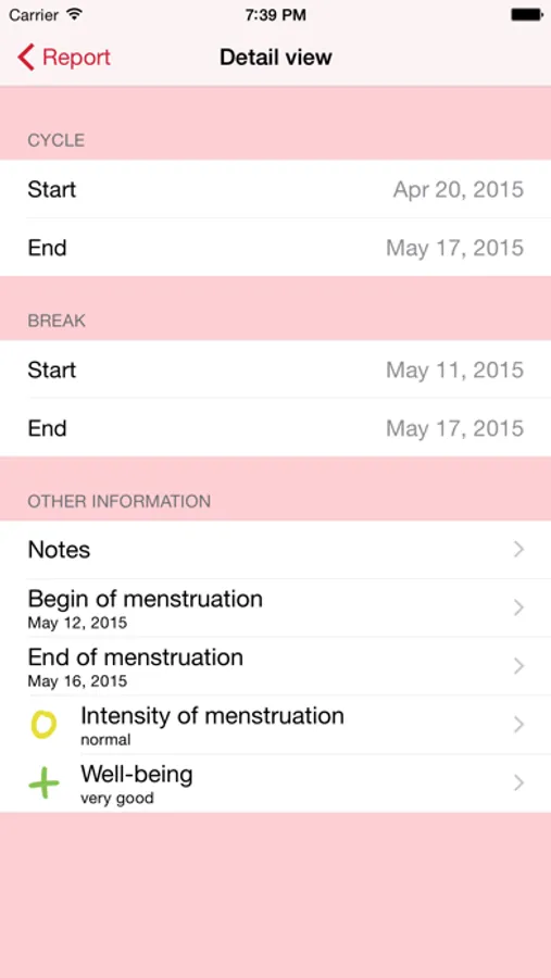 All your cycles will be stored with the most important information chronological in the report view. So e.g. you can easily check up when you had your last period. You can also add small notes for every cycle.