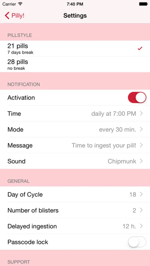 You can set up the time when you want to ingest your pill, even individual for every weekday. Furthermore you can choose between two packaging sizes (21 and 28 pills). You can even set up the message for the notification.