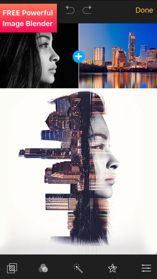 Pic Blender Art Photo Editor app is the superior way to create double exposure and graphic design images in seconds.