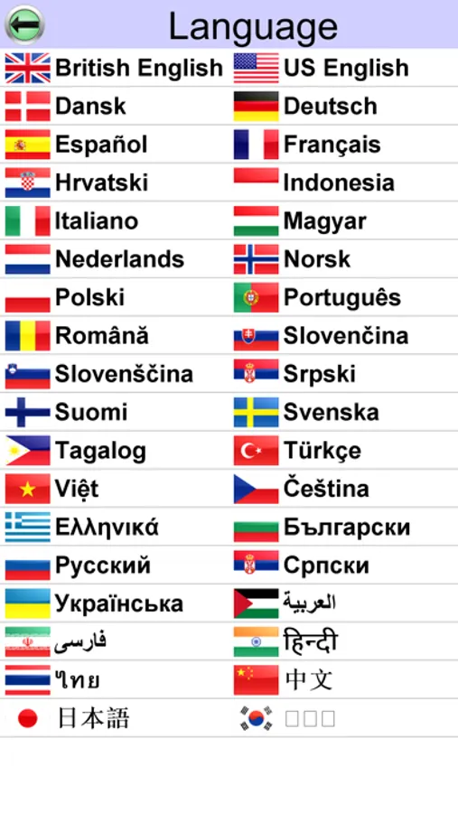 You can play this app in the following languages: English, French, German, Spanish, Portuguese, Italian, Dutch, Swedish, Danish, Norwegian, Finnish, Polish, Hungarian, Czech, Russian, Arabic, Bulgarian, Croatian, Greek, Indonesian, Romanian, Serbian, Serbo-Croatian, Slovak, Slovene, Turkish, Ukrainian, Afrikaans, Albanian, Azeri, Estonian, Latvian, Lithuanian, Catalan, Galician, Tagalog