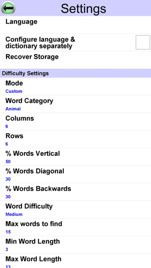 This helps avoid searching for many small words (a common problem in word apps). Also useful for specifying really difficult games (e.g. set both minimum and maximum word length to three).