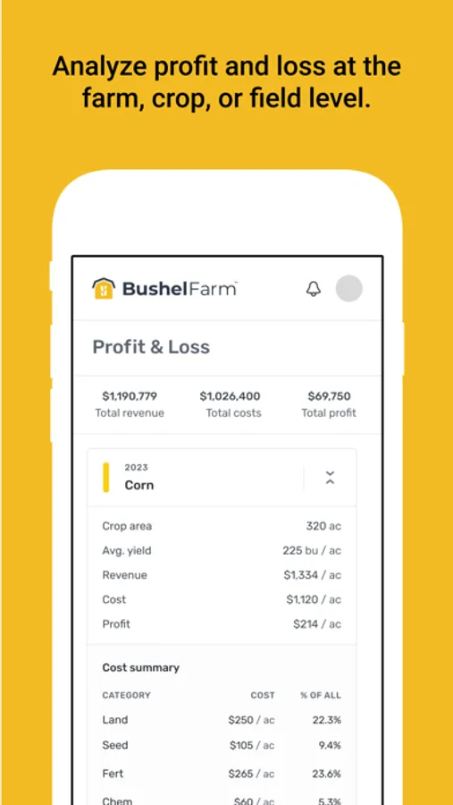 Powerful automation within the tool transforms farm records into valuable insights that farmers can use to plan and make decisions on their own or share with their grain buyers, agronomists, bankers, insurance providers, and other trusted farm partners. Insights include: cost of production; marketing position; profitability of grain sales; and profit and loss at the farm, crop, and field level.