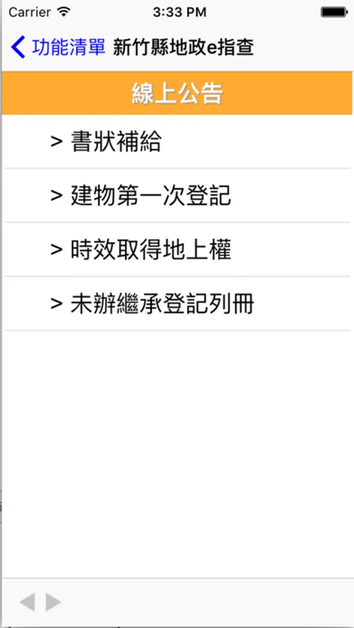 為提升地政便民服務品質,並節省民眾洽公時間,新竹縣政府地政處推出「新竹縣地政e指查」手機軟體,提供服務內容包含地政最新消息、案件(登記、測量、測量移案登記)辦理情形、新舊地建號、土地公告現值、申報地價、前次移轉現值及土地增值稅試算、案件推播通知及線上公告等查詢服務,並提供民眾查詢顯示最近之地政相關服務據點資訊及其地圖位置參考資料,民眾若有需要,歡迎多加利用!
