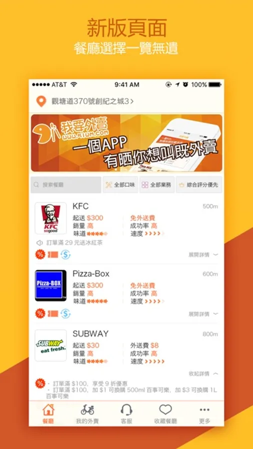 超過2,500間外賣餐廳任你揀,例如:KFC、板長壽司、PizzaBox,甚至你樓下間茶餐廳,總有一間岩你。 快餐、Pizza、壽司...一次過滿足你全家不同的口味。網上直接落單,令你可安在家中,隨時隨地享受一站式的線上外賣服務,非常方便、快捷,以後都唔駛再儲外賣紙,同埋打極都無人聽嘅外賣電話啦。立即下載《我要外賣》啦!
