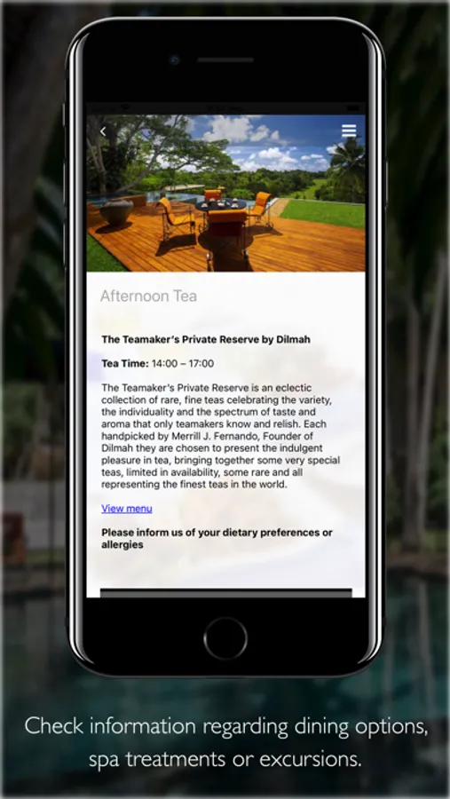 - Perfect your stay by viewing restaurant tables, excursions and activities such as snorkelling, scuba diving or spa treatments;