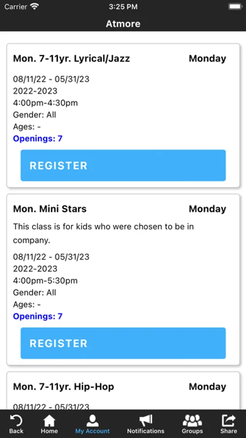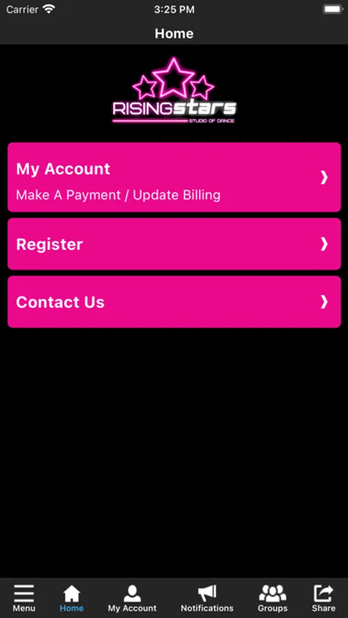 The Rising Stars app allows you to manage your account with ease, register for classes, parties, and special events. You'll also receive important notifications about class changes, closings, registration openings, special announcements, and upcoming events.
