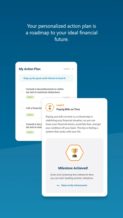 • Watch your score rise (and feel your financial stress drop) as you check off action steps.