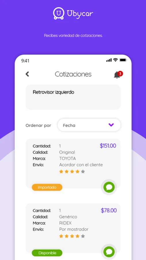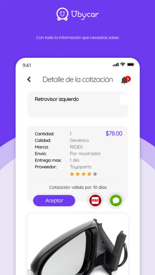 Con solo crear tu solicitud del repuesto o accesorio que necesitas, los proveedores lo reciben y te responden con la información que quieres saber, todo lo gestionas en un mismo lugar.