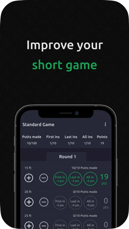Play a Standard game of Just Putt where you can log your Putts Made, First Ins, Last Ins and All ins.