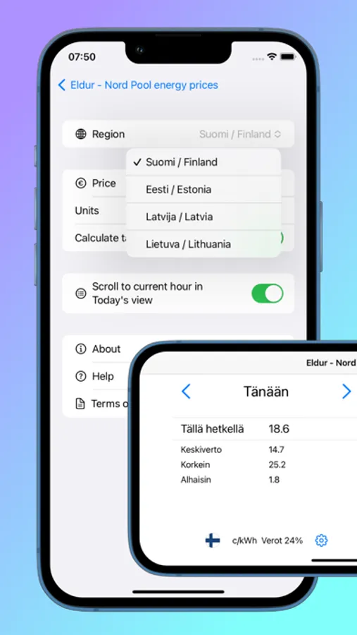 Eldur is an app designed for most convenient way of staying updated with electricity prices of the Nord Pool's Day Ahead Auction in Finland and Baltic states.