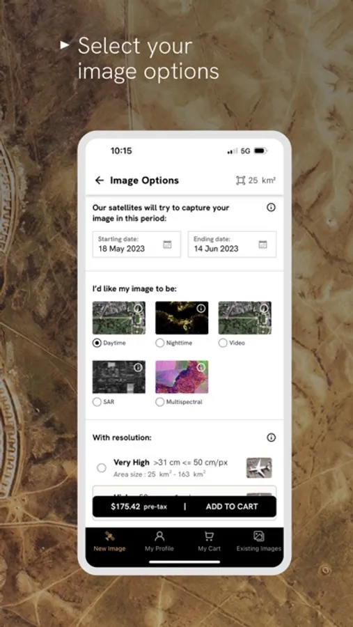 The process is simple and user-friendly. Either choose an Existing Image from our archive or order a New Image and have a satellite capture of your area of interest during a future date range of your choosing. Through the app, you can also select the sensor type that will best meet your needs, including daytime, nighttime, video, and radar.
