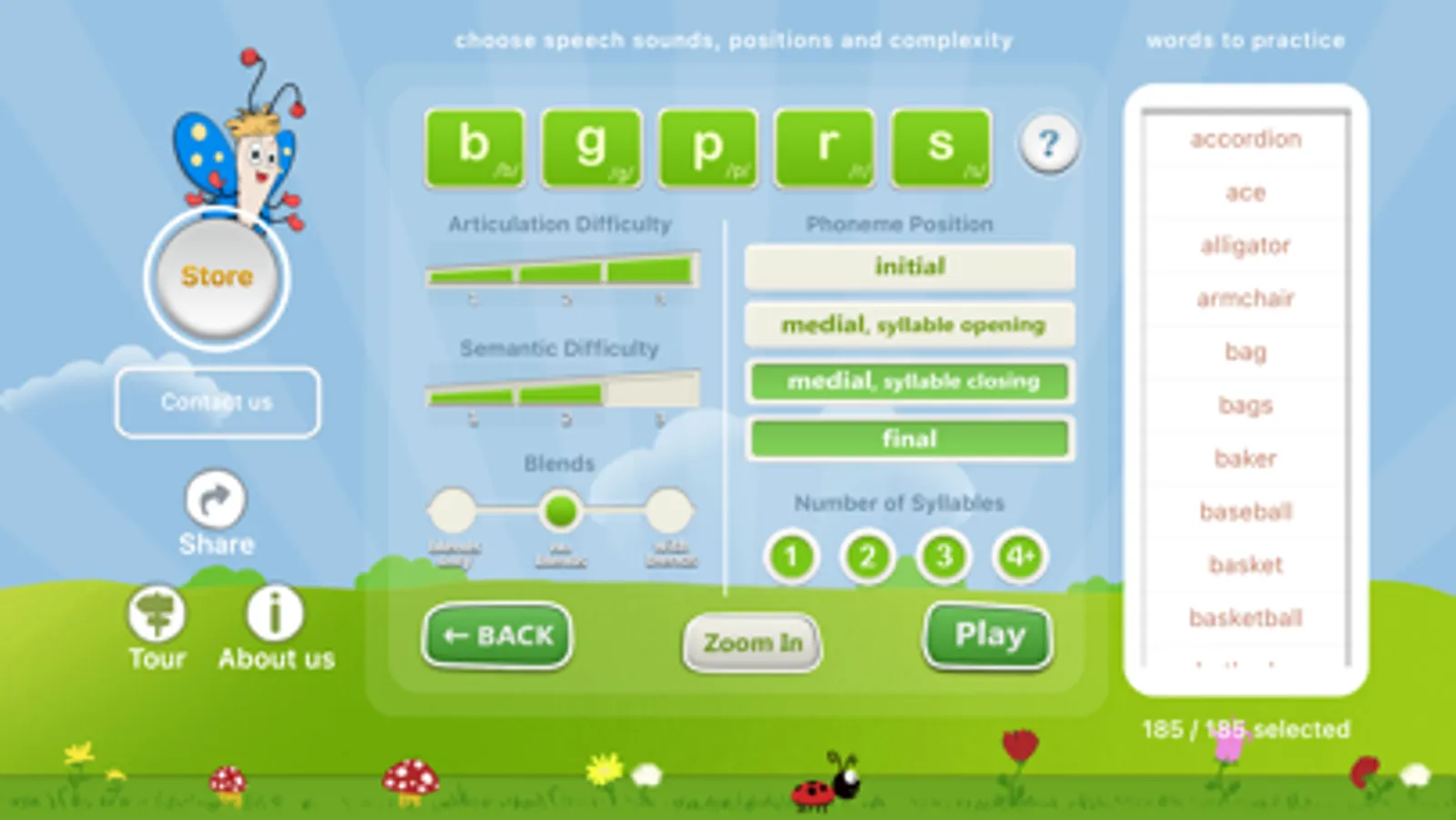 You can add or remove blends, increase or reduce semantic level, number of syllables and phonetic difficulty. You can practice a whole group of sounds by selecting several target sounds that share a phonetic category or address a type of error.
