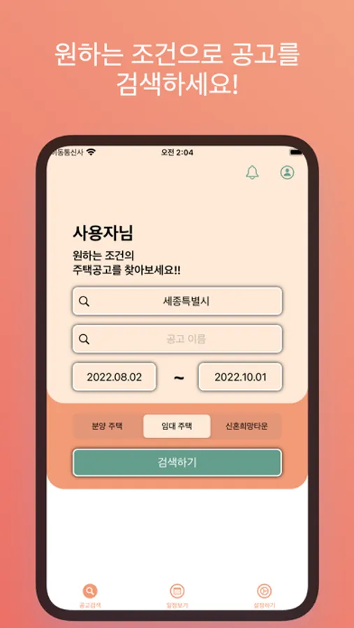임대주택, 분양주택, 신혼희망타운을 중심으로 원하는 지역, 공고명, 공고 상태를 중심으로 검색 기능 제공