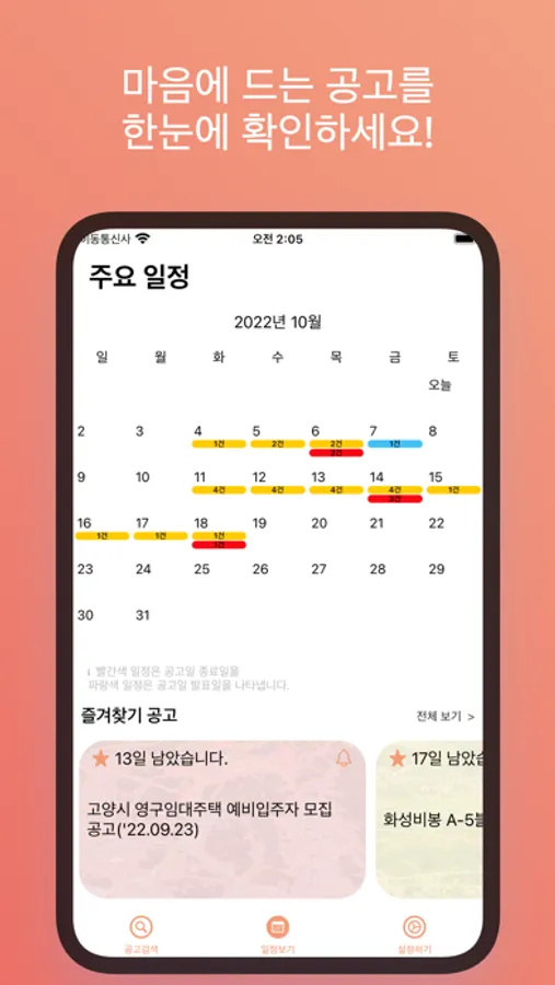 즐겨찾기 기능을 이용하면, 달력화면을 통해서, 즐겨찾기에 등록된 공고들의 스케쥴을 한 눈에 파악할 수 있습니다.