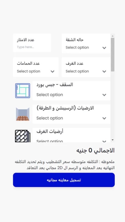 سهلنا عليك كتير علشان تعرف تحدد تكلفة التشطيب بنفسك بجمرد ما تكتب مساحة شقتك هيظهر كل تفاصيل التشطيب من خلال اختيارات تقدر تتحكم فى المقايسة بنفسك و تختار كل خامات التشطيب و بكدا تقدر تتحكم فى كل تفاصيل التشطيب و تقدر تختار السعر المناسب ليك