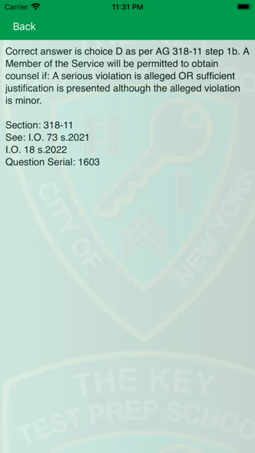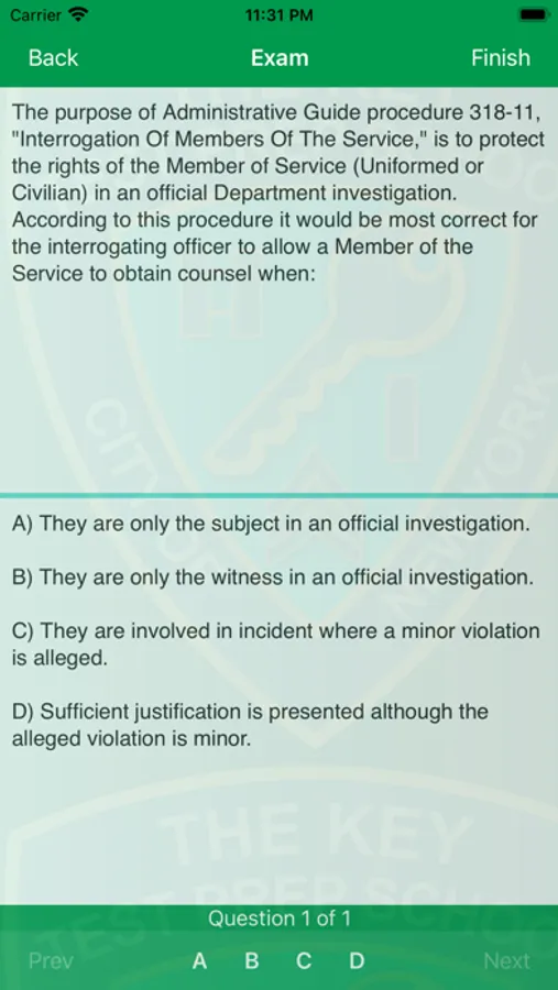 Includes Patrol Guide, Admin Guide, Judgement, Math, and Legal Bureau Bulletin questions.