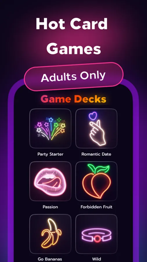 The challenges come in 6 different levels: 'Party Starter', 'Romantic Dare', 'Passion', 'Forbidden Fruit', 'Go Bananas' and 'Wild'. You can also create your own tasks and questions.