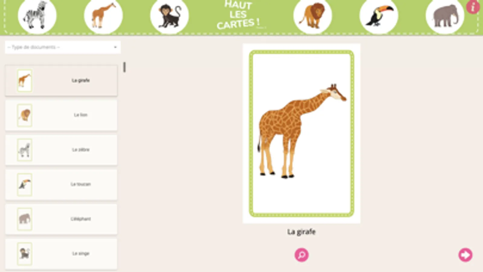 Chaque élève dispose d’un jeu de 6 cartes où sont représentés 6 animaux. L’enseignant présente le panneau et la question associée. Les élèves répondent en montrant la carte représentant l’animal qui correspond à la réponse.