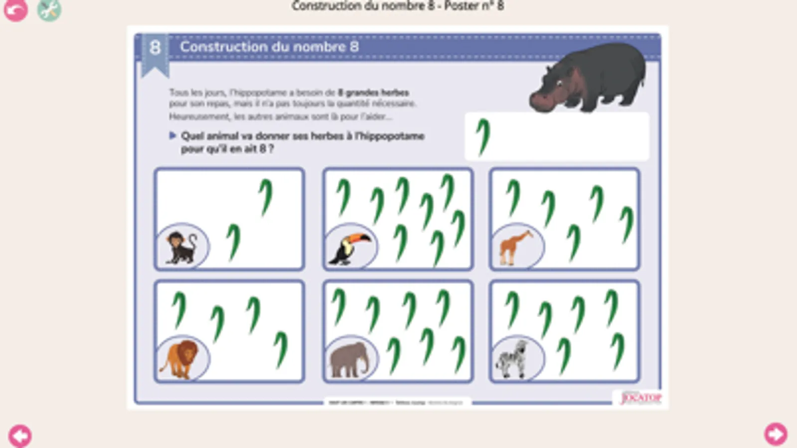 À travers des panneaux présentant des situations variées sur le thème de la jungle, les élèves sont mis en situation active d’apprentissage dans les domaines de la découverte des nombres, des formes, des grandeurs et des suites organisées.