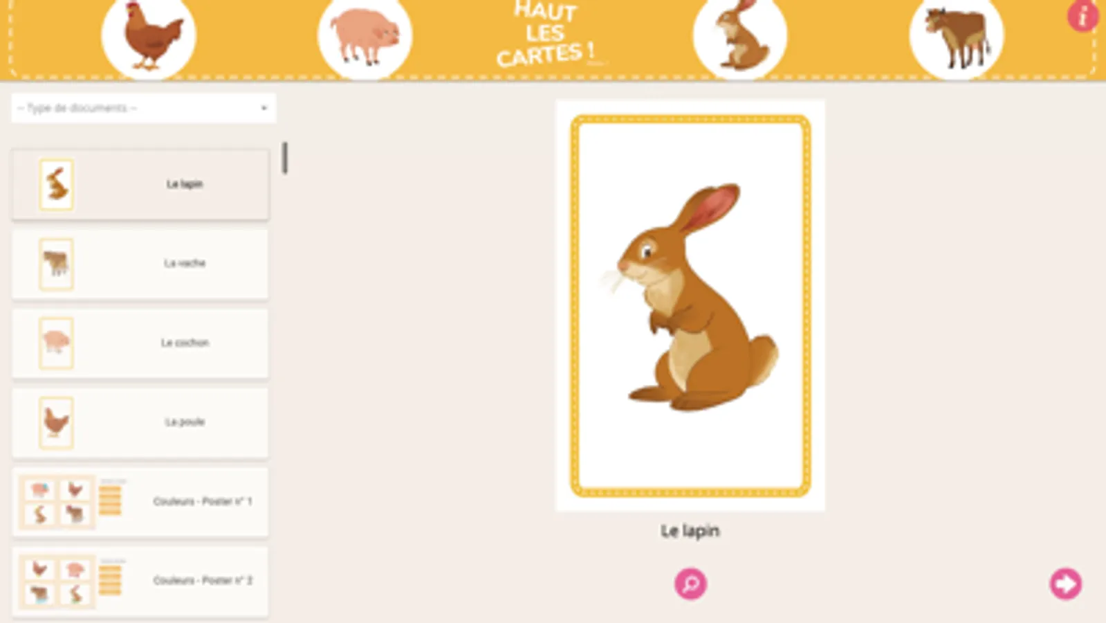 Chaque élève dispose d’un jeu de 4 cartes où sont représentés 4 animaux. L’enseignant présente le panneau et la question associée. Les élèves répondent en montrant la carte représentant l’animal qui correspond à la réponse.