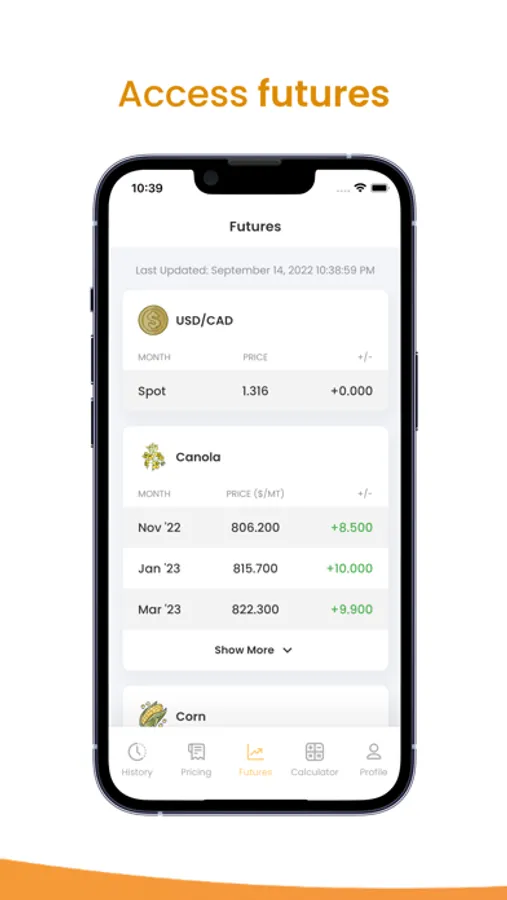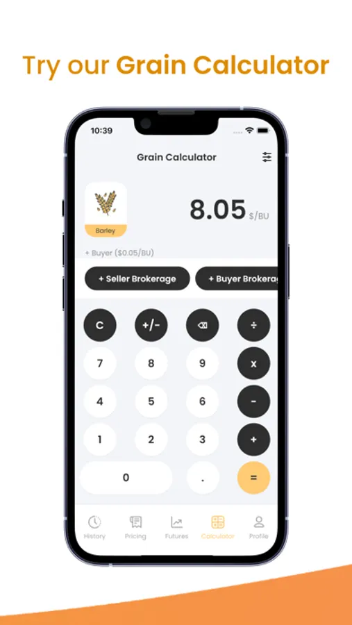 Convert prices and quantity in Bushels (BU), Metric Tons (MT), Pounds (LBS), and Loads. Use the operators to calculate pricing with AgFinity brokerage.