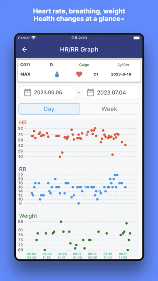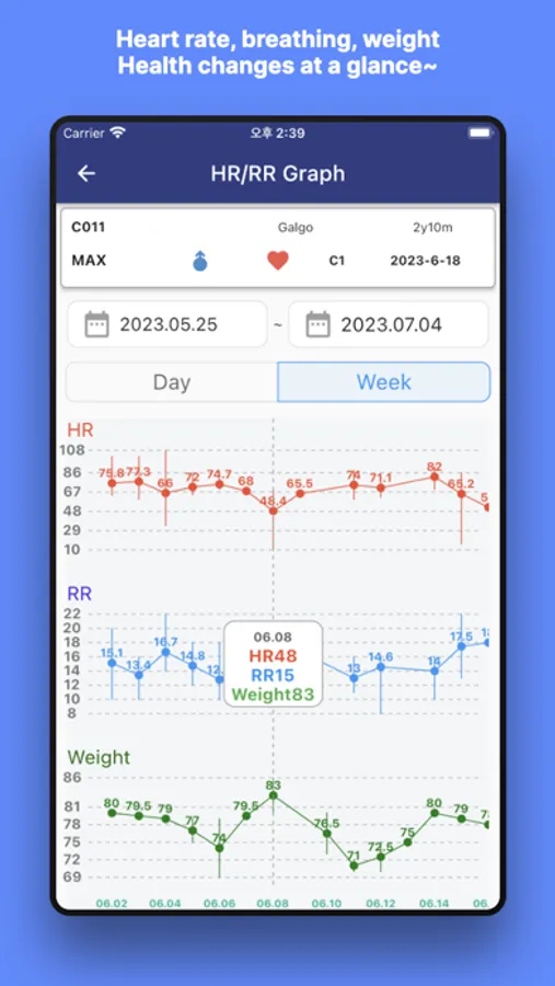 You can grasp heart rate, breathing rate, and weight information measured by pet at a glance.