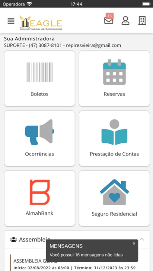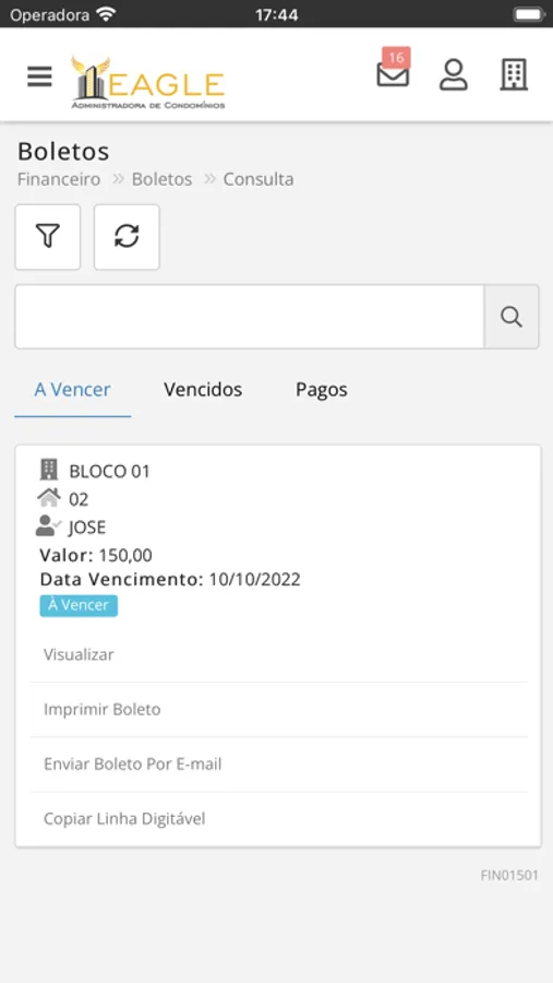 - Visualização de boletos em aberto para sua unidade;