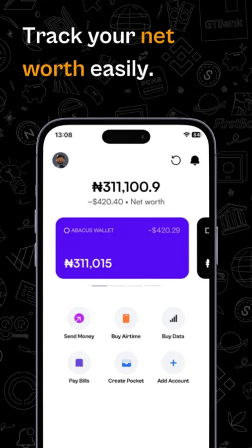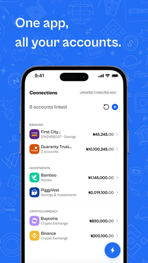 - Connect your GTB, Zenith, Kuda, Cowrywise, Piggyvest, First Bank, Chipper, FCMB, Pocket by Piggyvest, Stanbic, Carbon, Bundle, Binance accounts, and more in one secure app to get a concise sense of your net worth & keep tabs on your finances without having to open multiple apps.