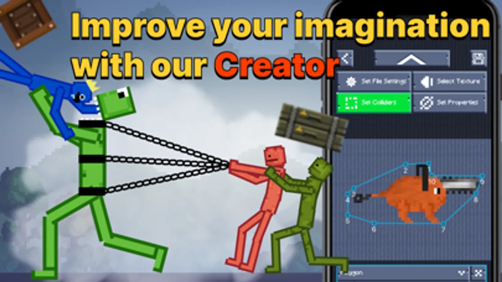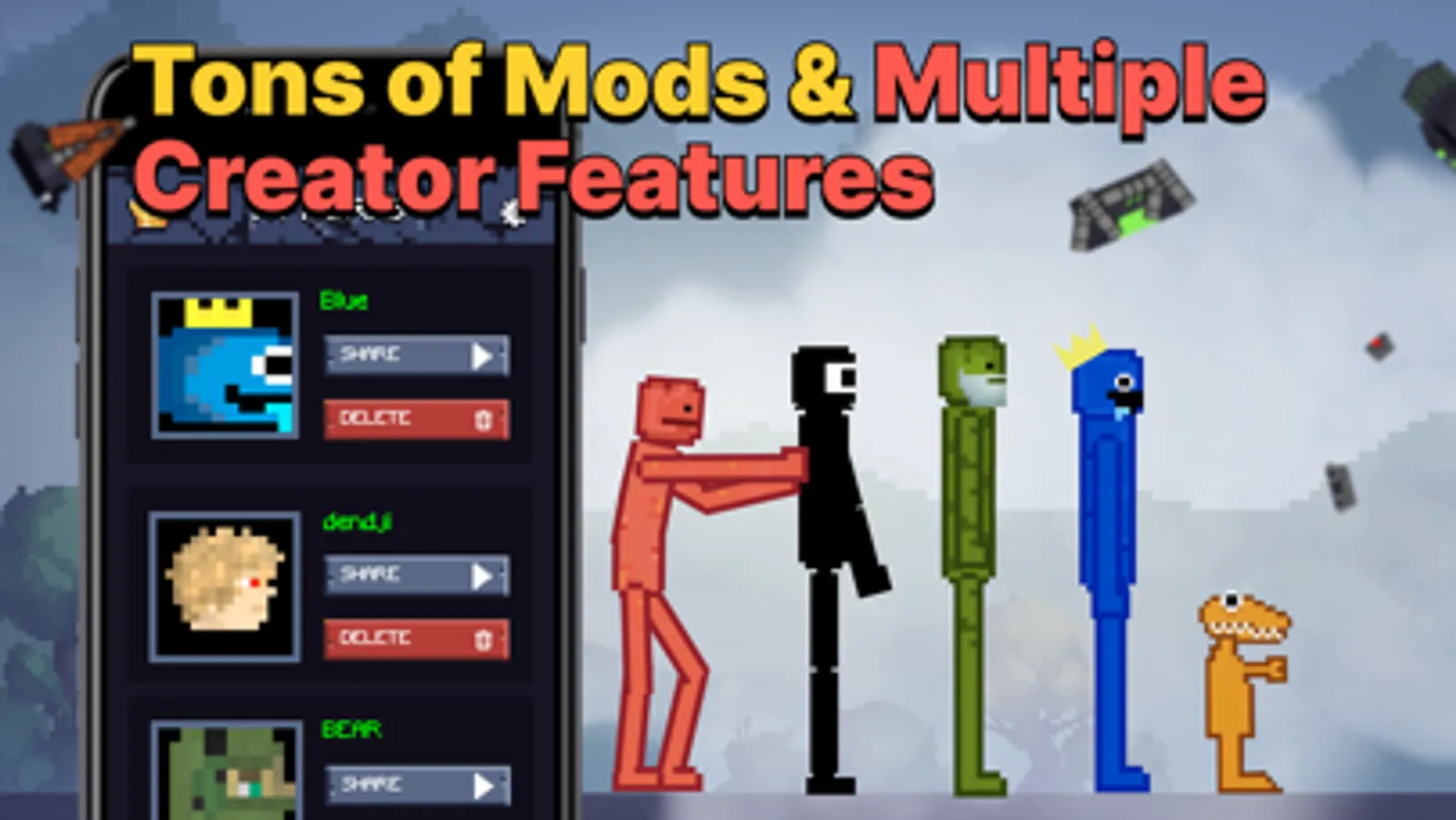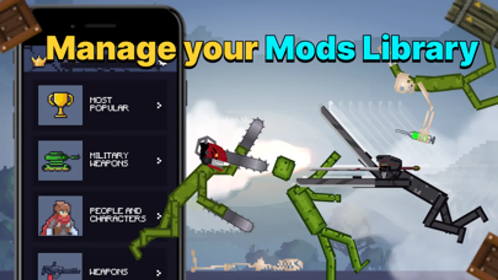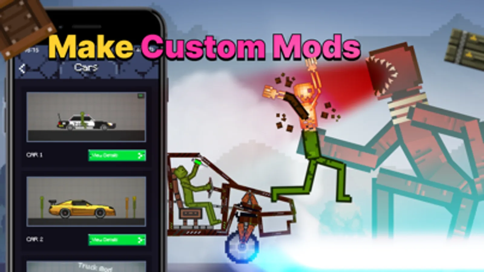 This app is the best mods and skins creator for Melon Playground game. You can create any character, vehicle, weapon or building. Also you can will simply build something from available resources such as dummies, weapons, items, cars and etc. More game content allows you to create more game scenes. Choosing our mod creator will increase your creativity to the maximum possibility.