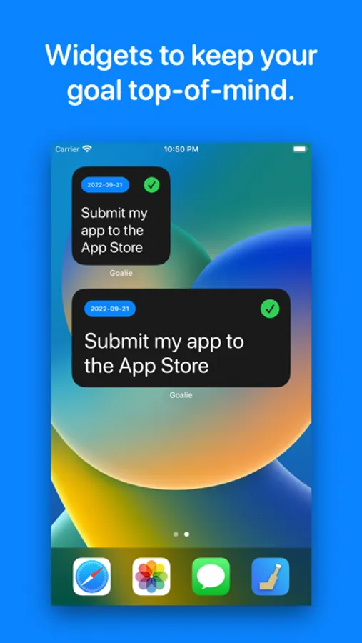 Goalie helps keep track of what's most important to you. Set one top-level goal for each day, and keep it top-of-mind with beautiful Home and Lock Screen widgets.