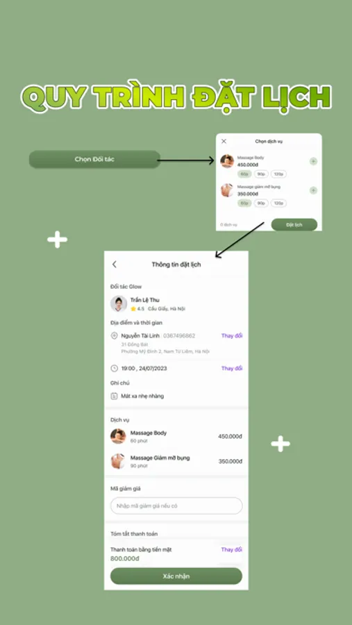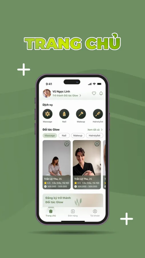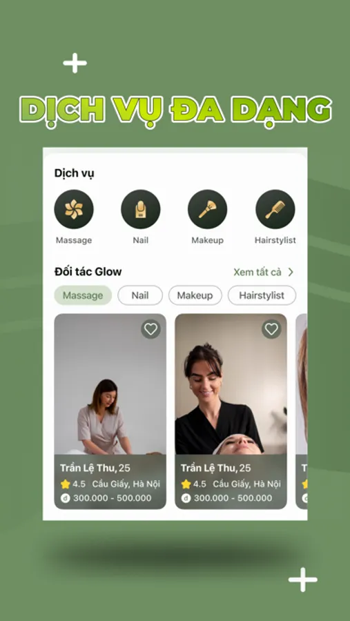 Với Glow, bạn có thể dễ dàng đặt lịch các dịch vụ Massage, Nail, Makeup, Hairstylist chỉ với một vài cú chạm trên điện thoại bất cứ khi nào, bất cứ địa điểm nào bạn muốn.