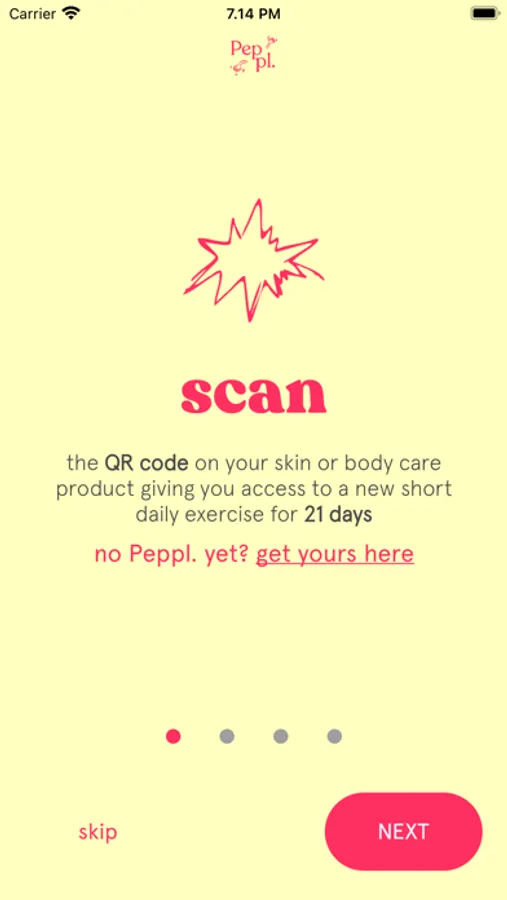 1. SCAN the Peppl. QR code sticking on your body or skincare product or the one you got on www.pepplhabits.com, this opens the Peppl. app to play your exercise of the day