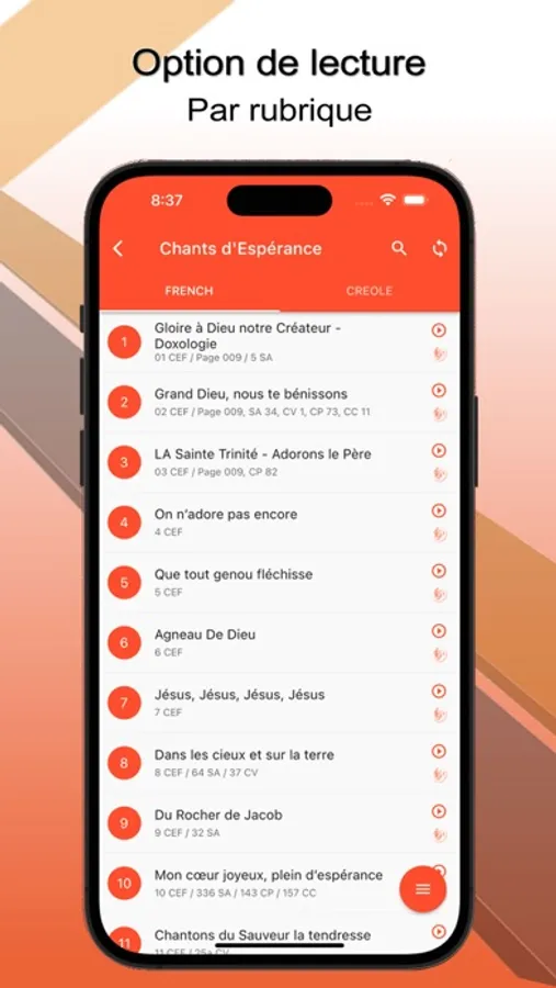 L'application propose plus de 12 Recueils des chants d’Éspérance et plus de 1700 lyrics disponible en français, créole et anglais en voici les grand titres : Chants D'Ésperance, Mélodies Joyeuse, Haiti Chante Avec Radio Lumière, La Voix du Réveil, Réveillons-Nous, Echo Des Elus, L'Ombre du Réveil, Gloire a l'Agneau, Les Cantiques de Beraca, Les Cantiques Spéciaux, Réveillons-Nous Chrétiens, Les Chants EEBV.