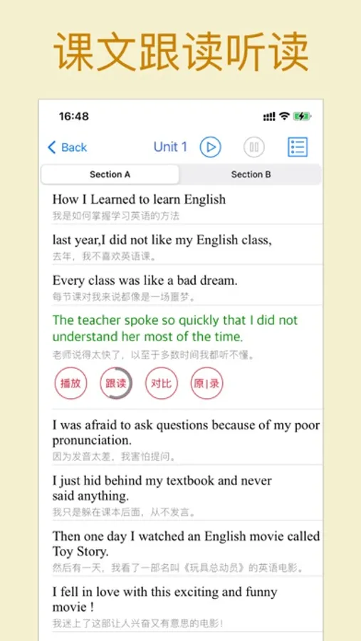 对课文内容按句子跟读,即时比对跟读结果