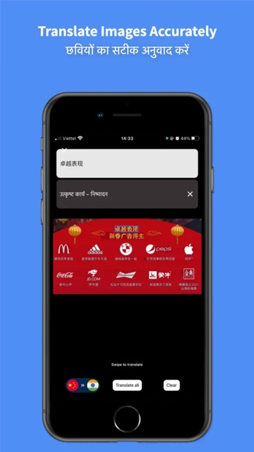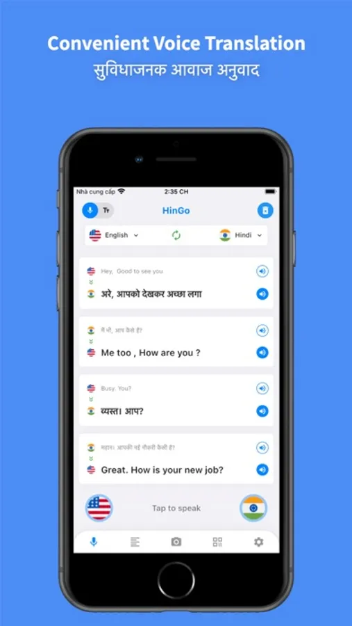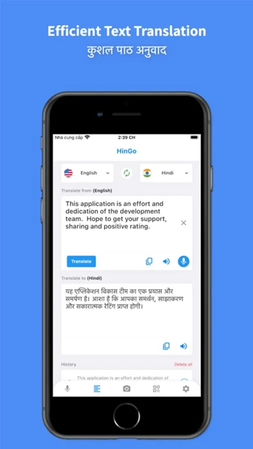 Hi ! HinGo is the leading Hindi Translator with a lot of outstanding features such as accurate voice translator, translate any text in 45 languages to hindi or hindi to any language such as: English, Korean, German, Japanese, Vietnamese, French, etc and extremely useful photo translating feature or learn hindi more easily.