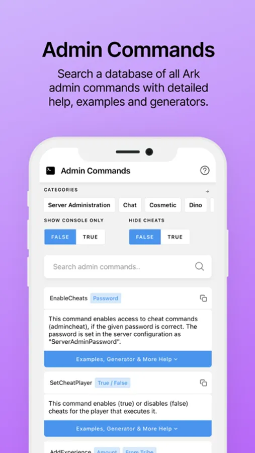 Find documentation for every Ark console command in an instant with our up-to-date admin commands database. Each command is complete with working examples and generators. The command generators allow you to adjust all of the parameters in app, outputting a working command for you to enter in-game.