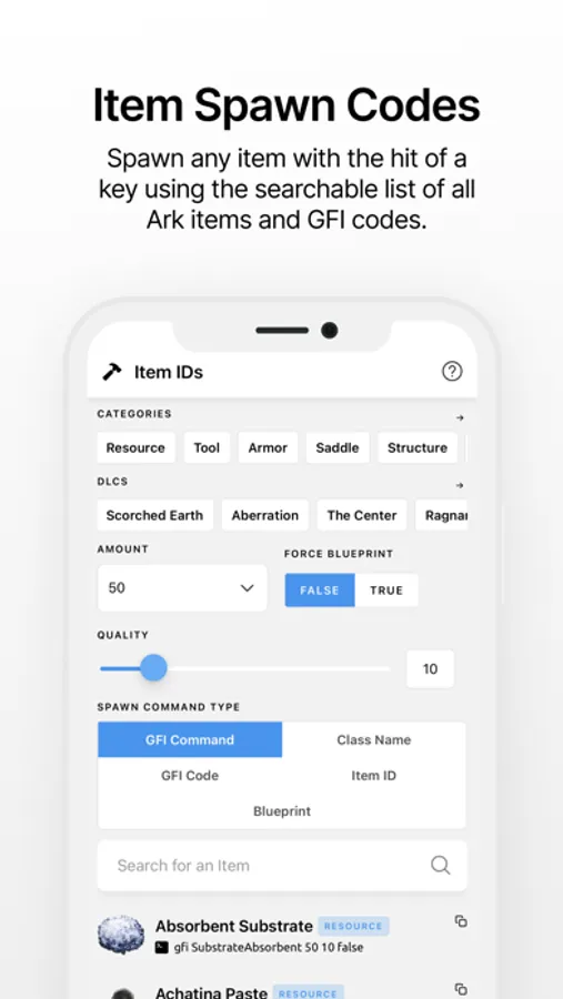 Use our item ID and GFI code list to search through over 1,000 Ark items and find the information you need to spawn them in-game. Use the settings to see an item’s spawn command, GFI code, item ID, or blueprint. Adjust the filters to view items from specific DLCs and categories.