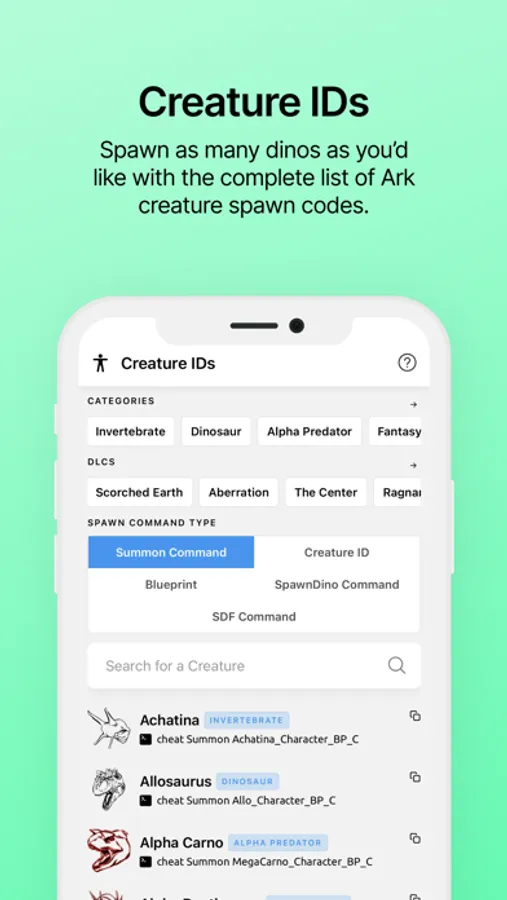 Our creature and dino ID list contains all creatures from Ark and DLCs. Simply search for a creature and get the command to spawn it in-game. Use the filters to view creatures from specific DLCs and categories.