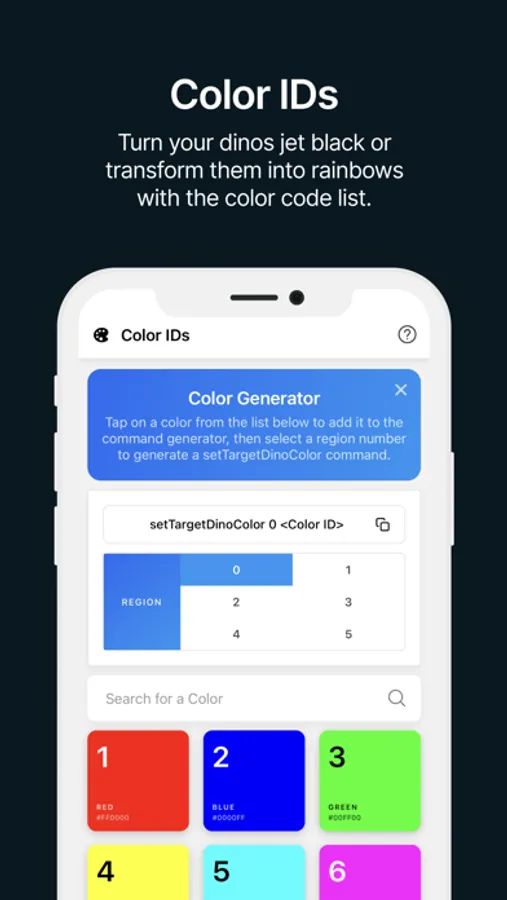 Use the list to get a color’s ID, or tap a color to place it into the setTargetDinoColor command generator, which will output a working command for you to use on dinos in-game.