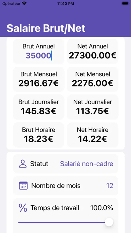 Vous pouvez calculer votre salaire brut net sur 13, 14 et 15 mois et si vous êtes temps partiel ou mi-temps, vous pouvez calculer votre salaire net en fixant votre taux.