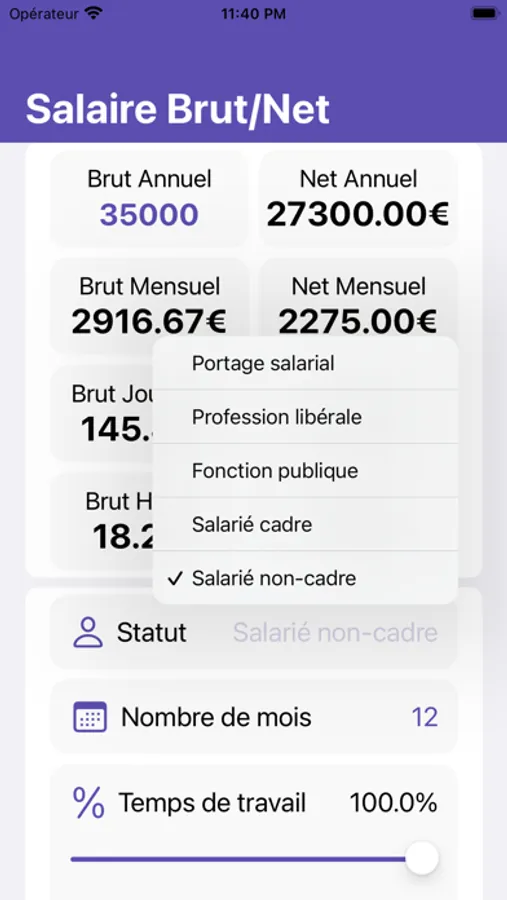 Vous avez également la possibilité de sélectionner votre statut actuel ou futur (cadre, non cadre, salarié, etc.) pour obtenir l'estimation de salaire net la plus cohérente possible.