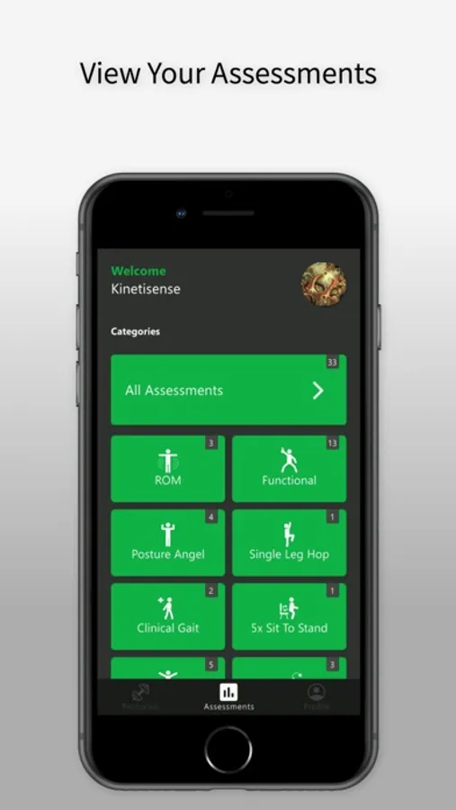 The Kinetisense Patient App is used by patients of the Kinetisense 360 Product. Here patients are able to see their assessment and profile data for personal analytics. The application has detailed statistics of each assessment done for a variety of different types each with their own unique details and scoring statistics. Videos can also be viewed by the patients for real time feedback on their assessments.