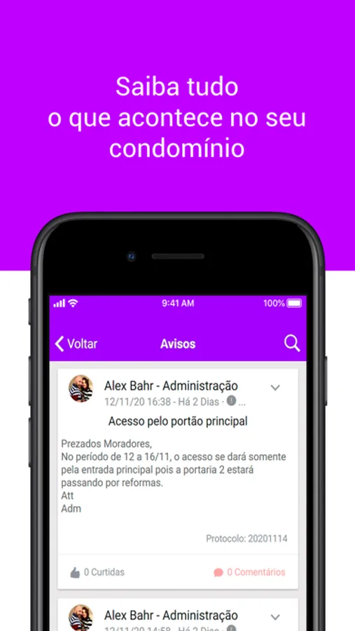 Receba notificações em seu celular de tudo que acontece no seu condomínio.