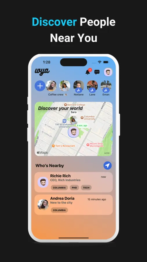 WYA – "where you at?" – the ultimate solution for connecting with new people nearby and for keeping in touch with your friends!