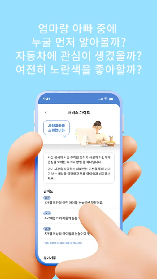 시선 응시와 시선 추적은 영아가 사물과 타인에게 관심을 보이는 최초의 방법 중 하나입니다. 아이 시각을 자극하는 재미있는 미션을 통해 아이가 보는 세상을 이해하고 또래 아이들과 비교해보세요!