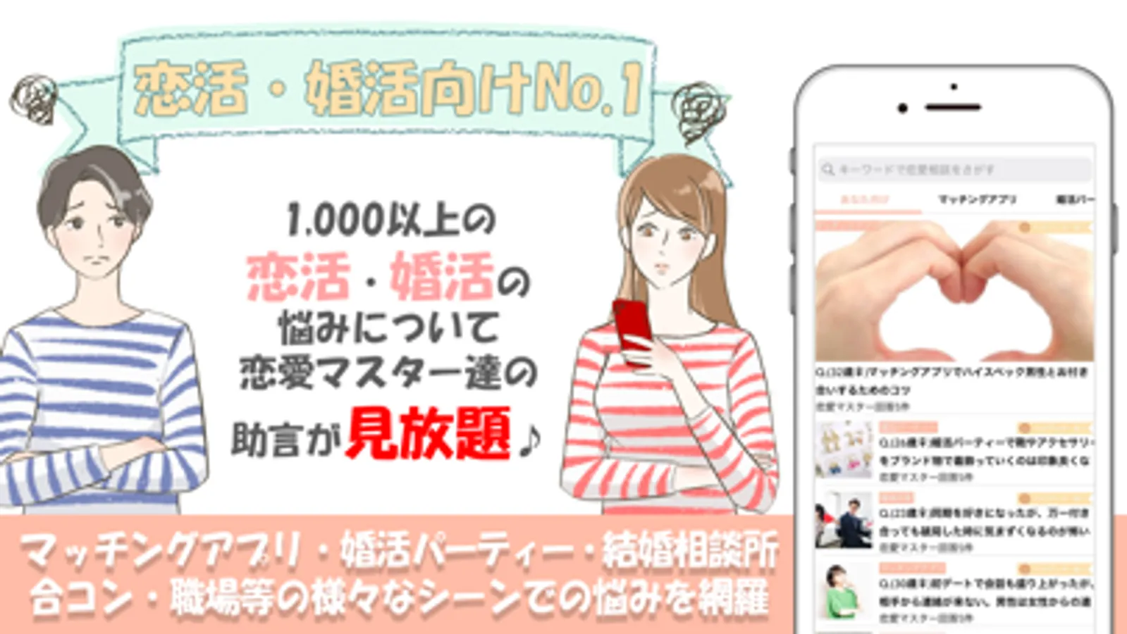 「マッチングアプリでハイスペック男性と付き合うコツって何?」「婚活パーティーで一番女性受けする服装ってどんなの?」「結婚相談所で、条件は良いのだが、好きなのかどうか分からない。本交際に進むべき?」など、1,000以上の恋愛相談についての恋愛マスター達のアドバイスや助言が見放題です。