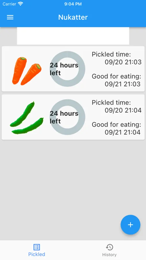 ・最初はどちらも空なので、右下の+ボタンから野菜と漬ける予定時間を選択して、追加して下さい。「漬かってる」リストに入ります。